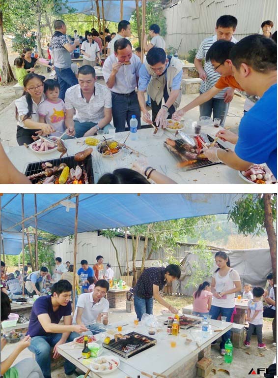余兴未尽的员工们,一边烧着手中的食物,一边相互交流烧烤技巧和心德,最后不忘为出租车的司机在佬备上这些丰富的食品。