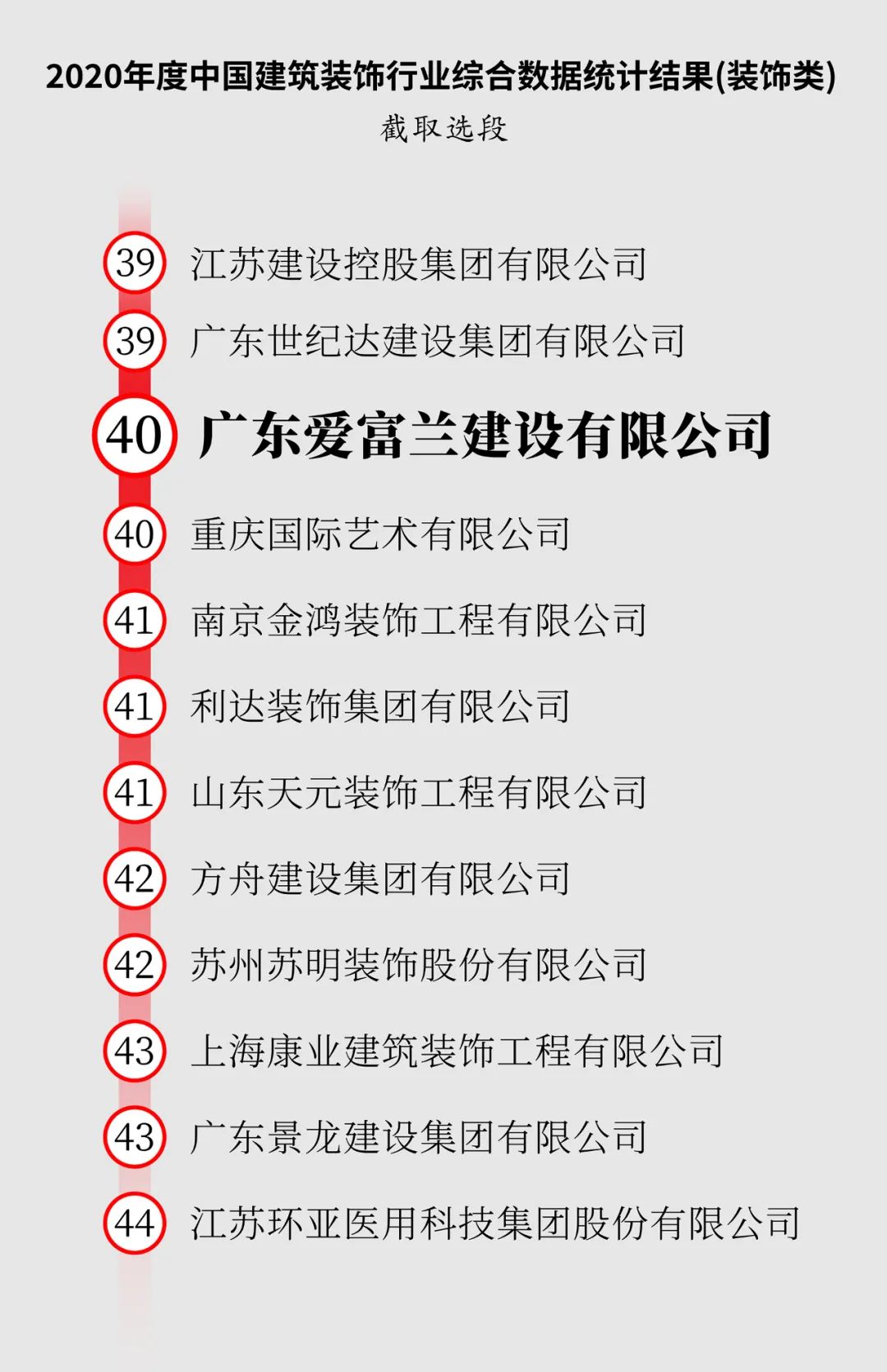 作为国内建筑装饰行业企业综合实力评定指标之一,中国建筑装饰协会于每年年底发布的年度中国建筑装饰行业综合数据统计结果一直受到行业内外的持续广泛关注。近日,2020年度中国建筑装饰行业综合数据统计结果在中装新网上予以了公示,广东爱富兰建设有限公司在本次装饰类统计中排名进一步提升,前进了7个名次,位于第40名——这是爱富兰连续第十二年获得此项殊荣,也是首次挺进前40强队列,是企业综合实力实现大跨越的又一次强势见证和资质增值。