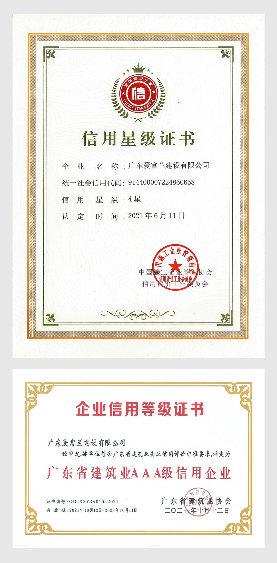 爱富兰企业发展的征途上从来不缺“一处绽放、遍地开花”的好势头,除了在“百强名单”传来喜讯外,我司在本年度行业多个信用评定中,接连蝉联或首次获得多项信用等级新荣誉,包括此前已通过喜报发布过的我司再次获得中国建筑装饰协会评定的企业信用AAA等级及首次膺获中国施工企业管理协会评定的工程建设企业AAA信用等级之外,爱富兰还陆续获得由中国施工企业管理协会颁发的4星信用星级证书及由广东省建筑业协会颁发的广东省建筑业AAA级信用企业证书等,而这些信用荣誉都是爱富兰的“第一次”。